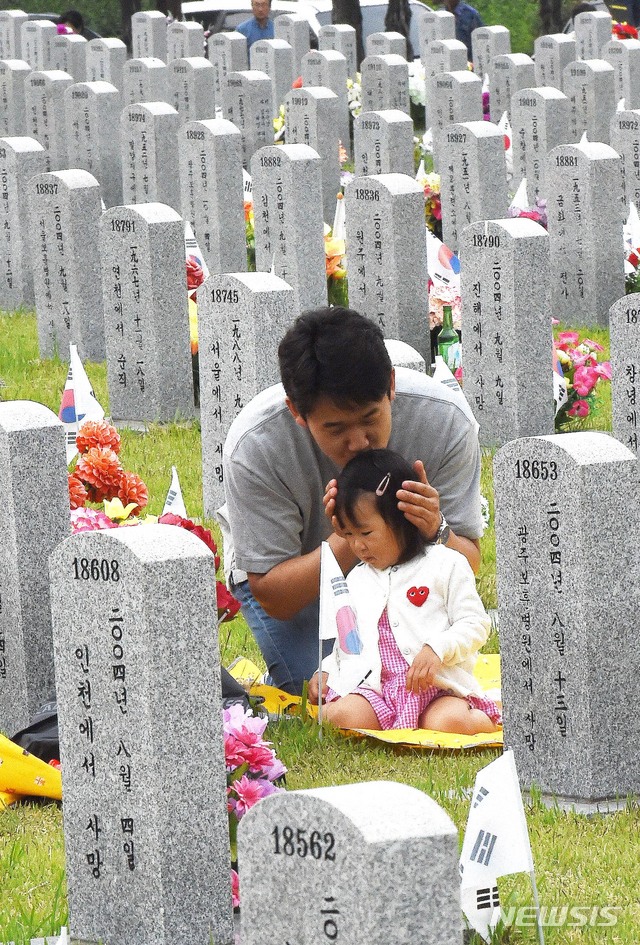 묘역에서 딸에게 뽀뽀해주는 아버지
