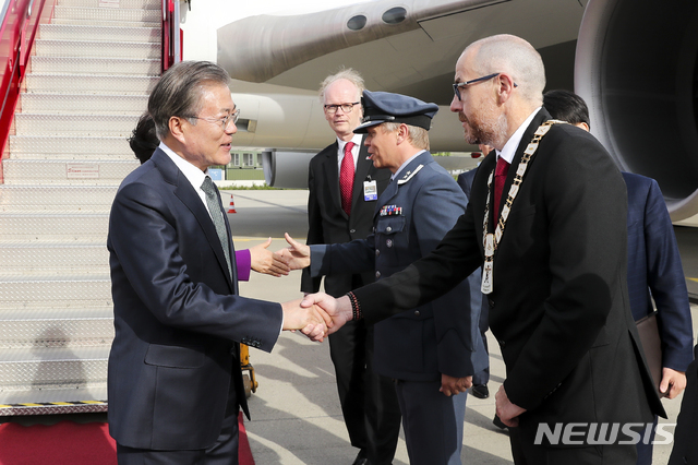 하랄 5세 국왕과 의장대 사열하는 문 대통령