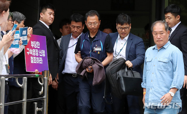 굳은표정으로 법정나서는 김명환 위원장