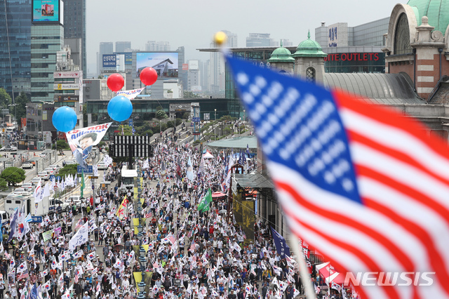 태극기-성조기 휘날리는 서울역
