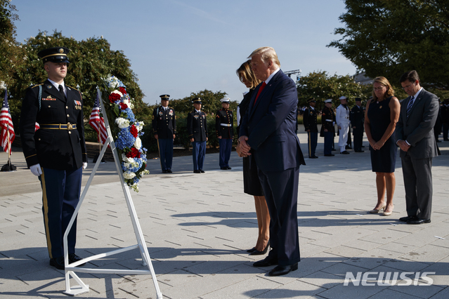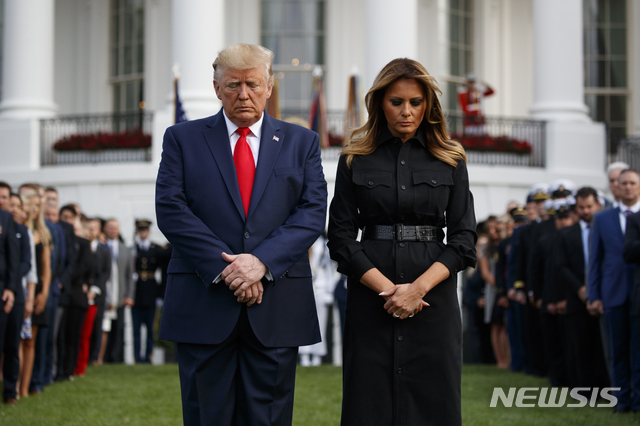 911 희생자 추모식에서 묵념하는 트럼프 대통령 부부