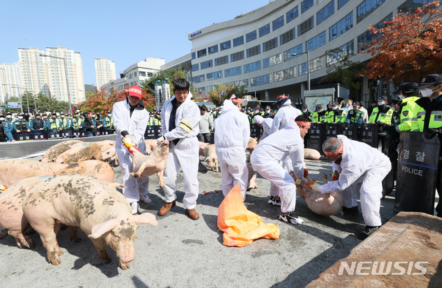 농식품부 앞에 몰려있는 돼지들