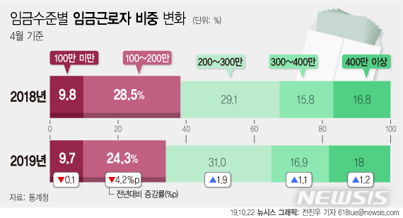 [그래픽]임금근로자 3명 중 1명 월급 200만원 미만…1년새 4.3%p↓
