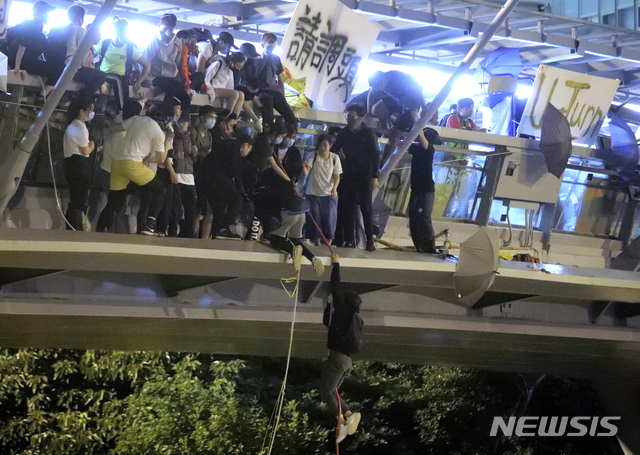 밧줄 이용해 탈출 시도하는 홍콩 시위대