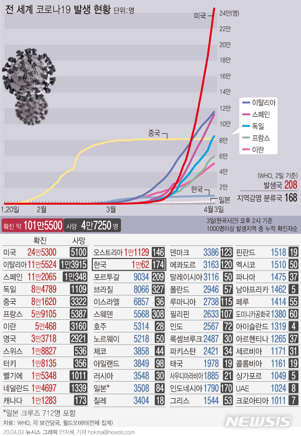 [그래픽]전 세계 코로나19 현황…101만명 확진, 사망자 5만명 육박