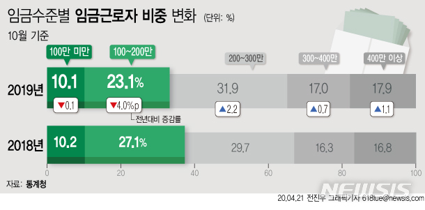 [그래픽]임금근로자 3명 중 1명 월급 200만원 미만