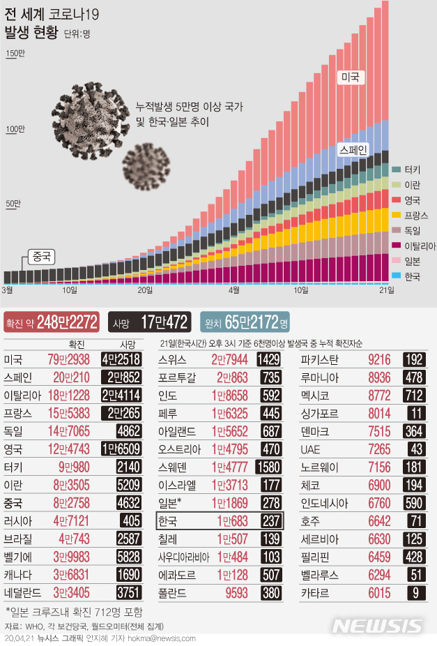 [그래픽]전 세계 코로나19 현황…248만명 확진, 사망자 17만여명