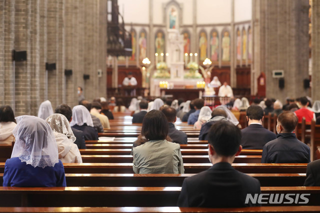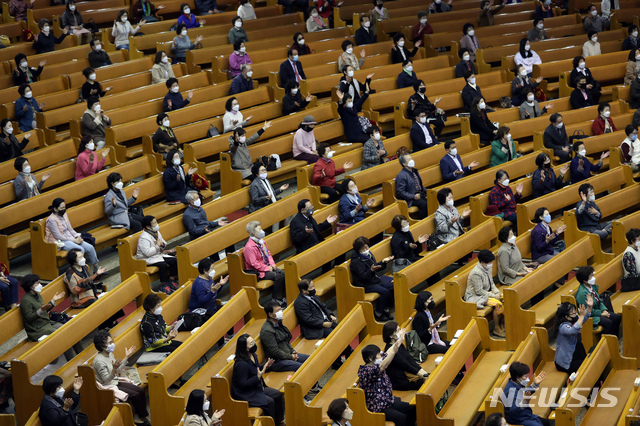 거리두고 예배하는 신도들