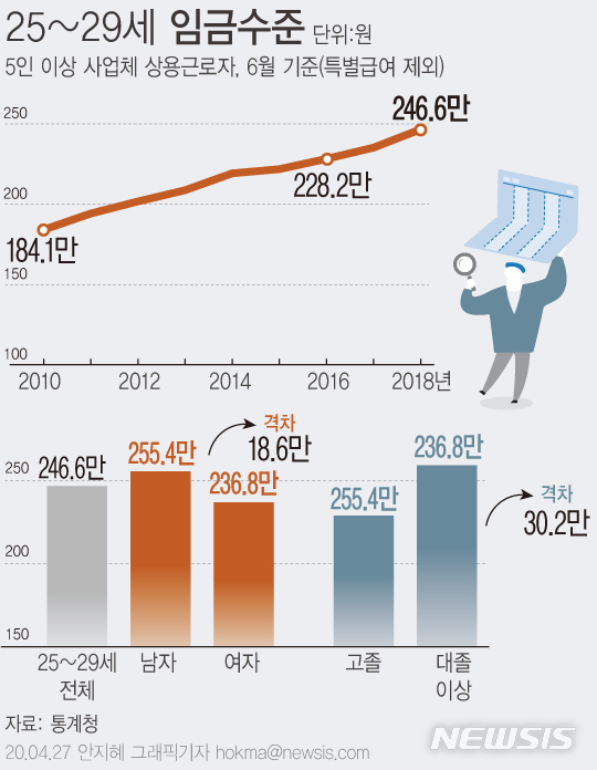 [그래픽]25~29세 평균 임금 246.6만원…남녀 격차 18.6만원