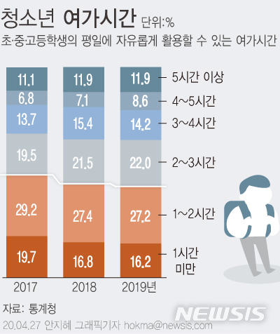 [그래픽]청소년 43.4%, 여가시간 2시간 미만