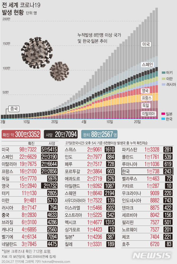[그래픽]코로나19 전 세계 확진자 300만명 넘어