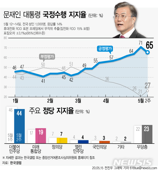 [그래픽]文대통령 지지도 65%…6%p↓ (갤럽)
