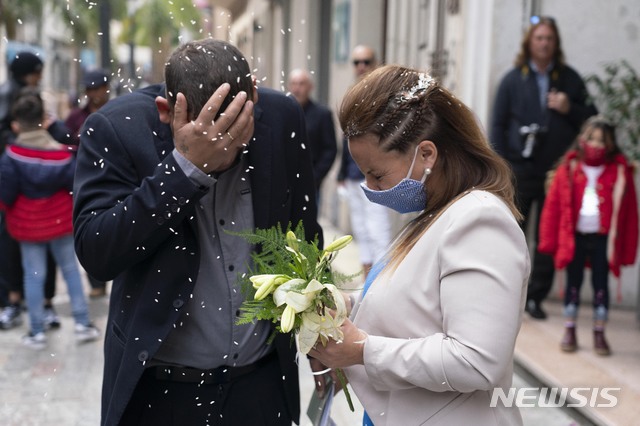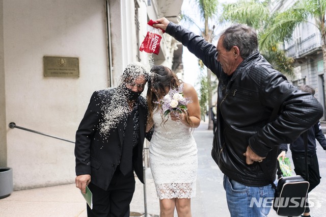 쌀 세례로 축하받는 우루과이 신혼부부