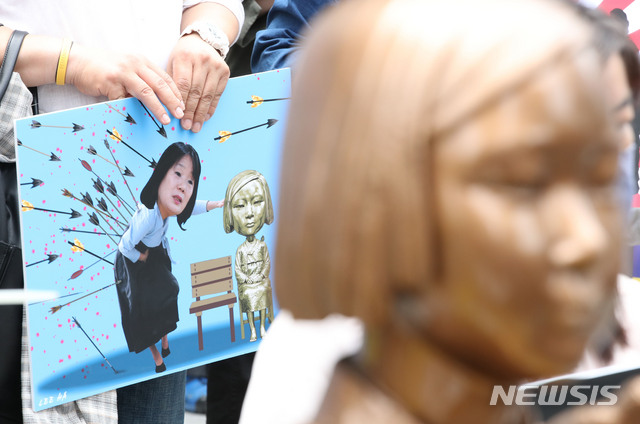 소녀상 너머로 보이는 윤미향 의원의 얼굴