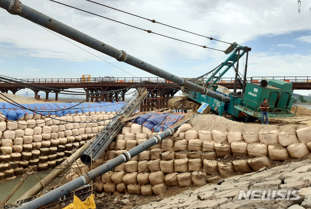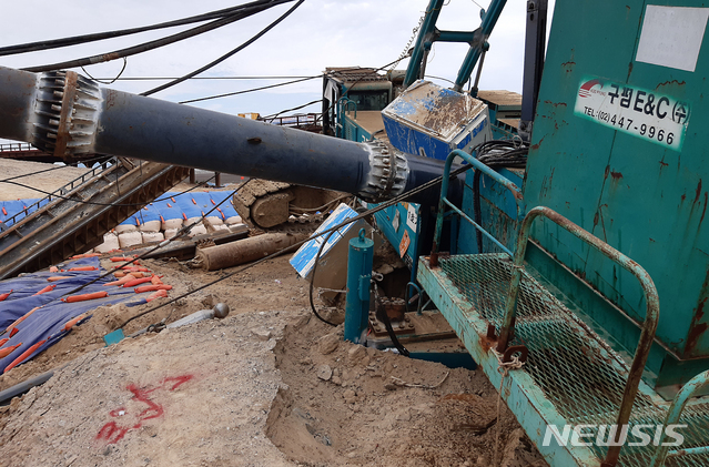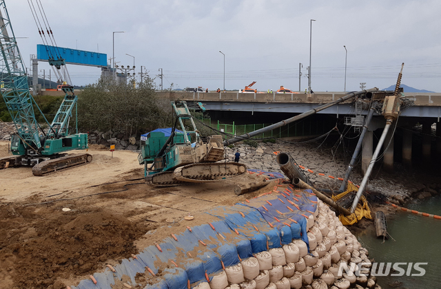 영종대교 일부 차선에 전도된 항타기