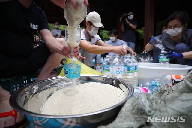 북한에 보낼 쌀 담는중