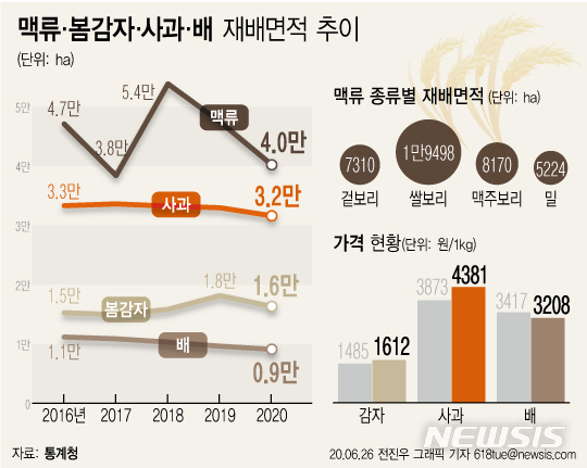 [그래픽]맥류·봄감자·사과·배 재배면적 추이