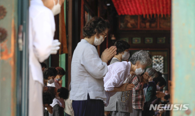 마스크 착용하고 기도 드리는 신도들
