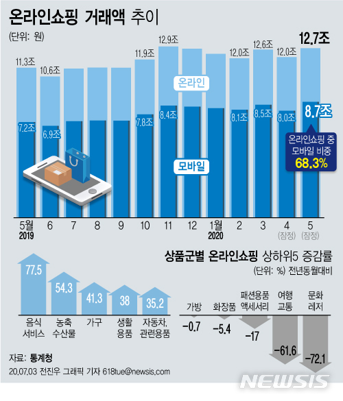 [그래픽] 5월 온라인쇼핑 13%↑…배달음식 늘고 영화·레저·여행 감소