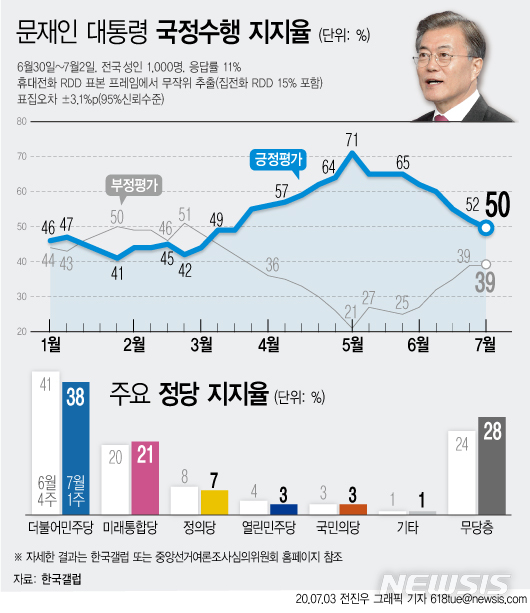[그래픽]文대통령 지지도, 5주 연속 하락 50%…부동산 논란 영향(갤럽)