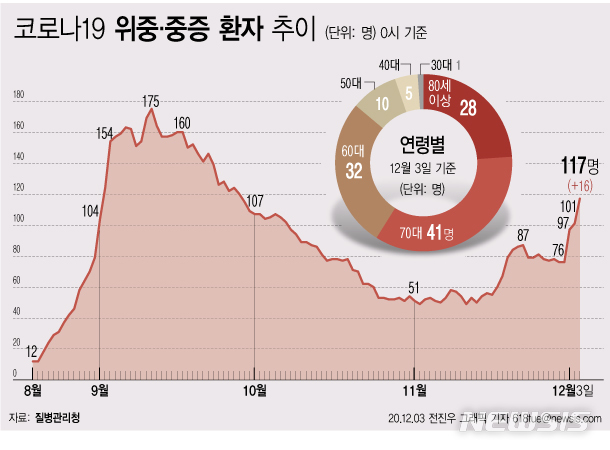 [그래픽]위중증 환자 하루새 16명 증가해 117명