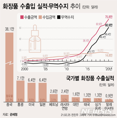 [그래픽] 지난해 화장품 수출액 사상 최대…전년대비 16.1% ↑