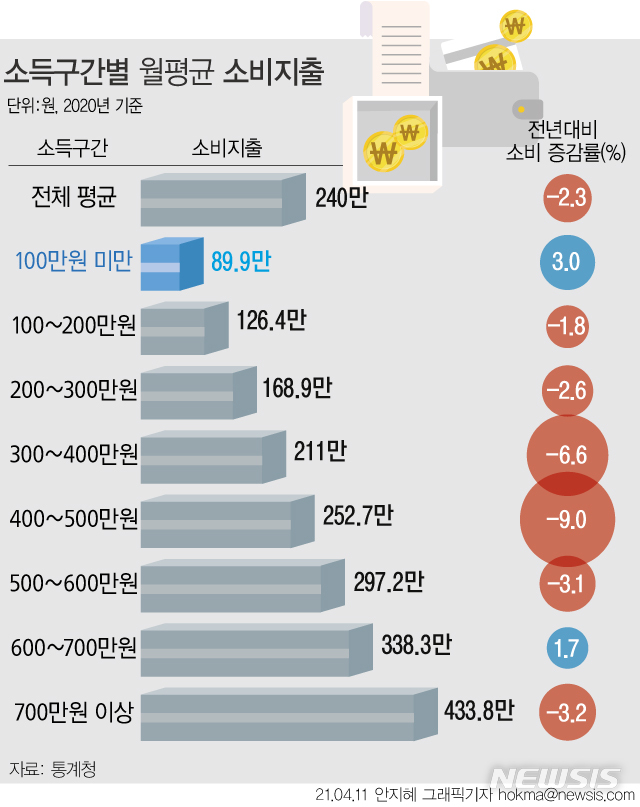 [그래픽] 저소득층, 월 100만원 미만 벌어 90만원 썼다