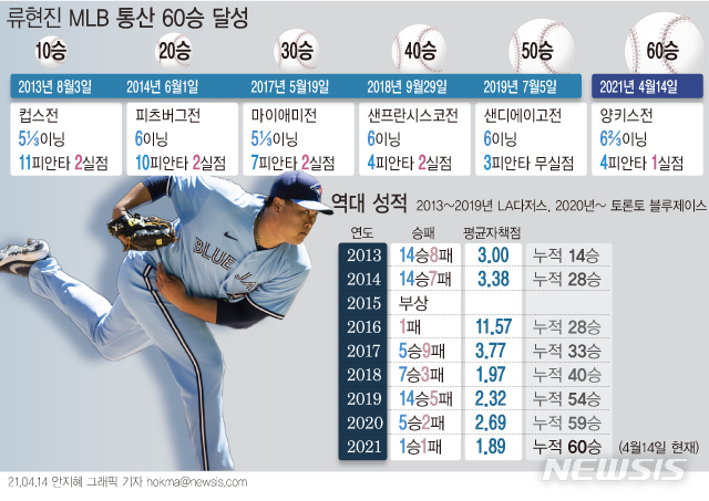[그래픽] 류현진 MLB 통산 60승 달성