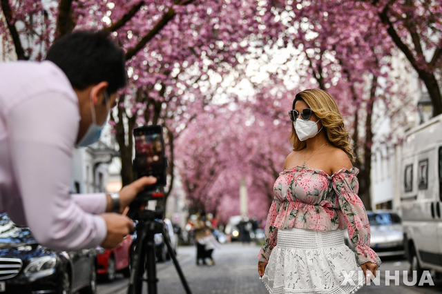 만개 벚꽃 배경으로 사진찍는 커플