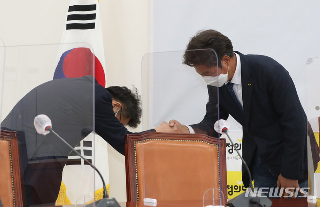 여영국 대표와 악수하는 이철희 정무수석