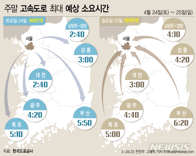 [그래픽]주말 고속도로 교통, 봄 나들이로 '평소보다 혼잡'