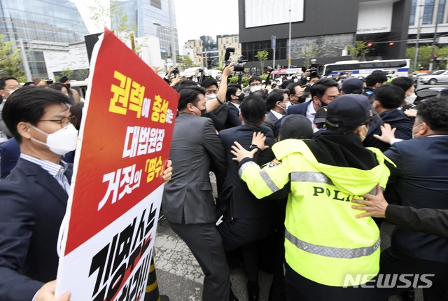 경찰에게 저지 당하는 주호영 당 대표 권한대행