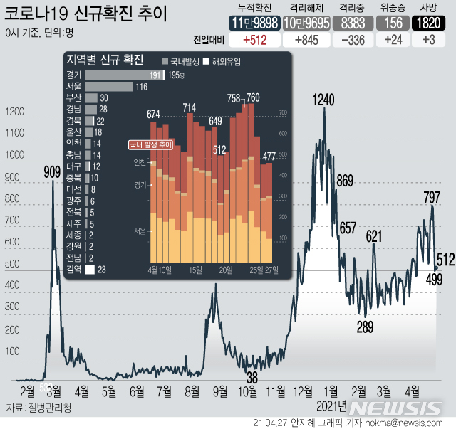 [그래픽] 코로나 신규확진 512명, 위중증 24명 증가