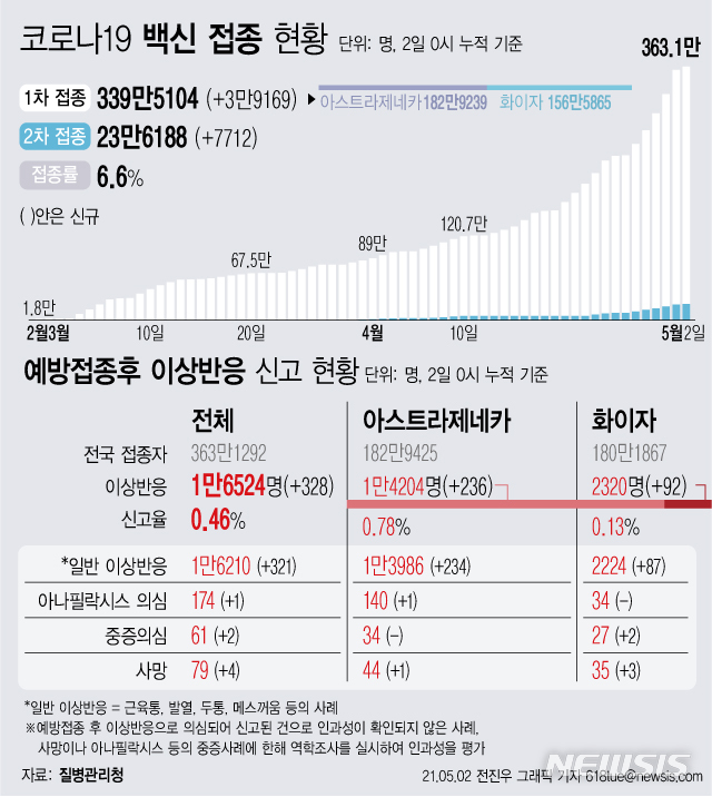 [그래픽] 백신 1차 접종 363.1만명…사망 의심 신고 4건 증가