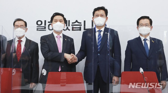 악수하는 송영길 대표-김기현 대표 권한대행
