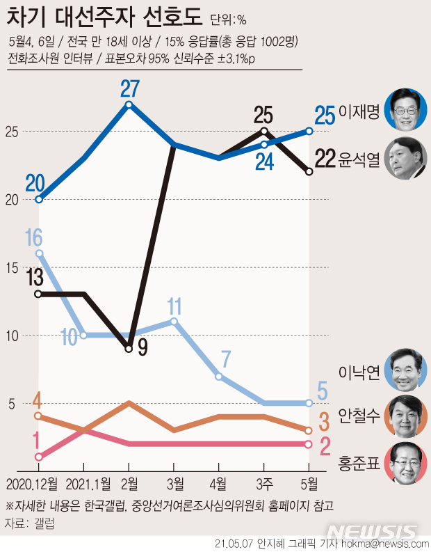 [그래픽] 차기 대선주자 지지율, 이재명 25%, 윤석열 22% (갤럽)