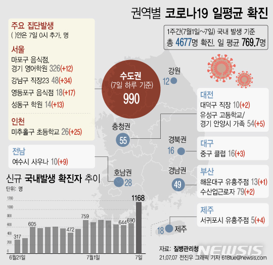 [그래픽] 코로나19 주간 일평균 769.7명 확진… 수도권은 7일 하루 990명