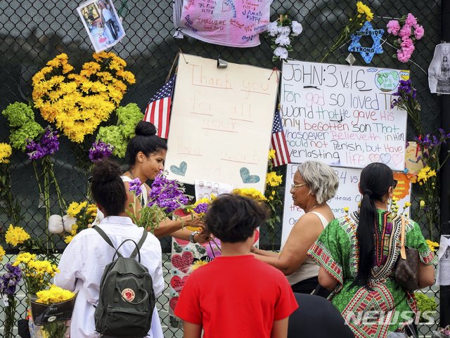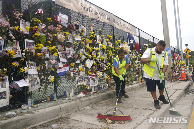 아파트 붕괴 임시 추모소 꽃 교체하는 자원봉사자들