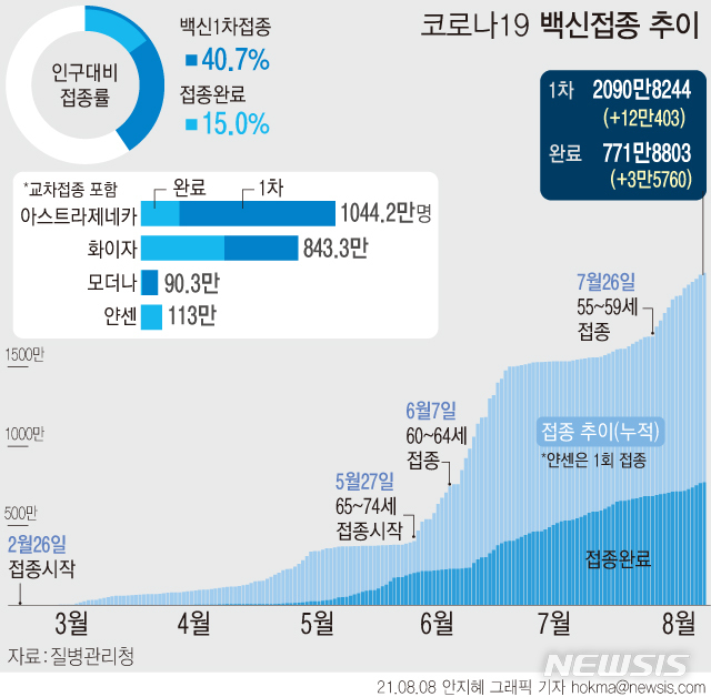 [그래픽] 백신 1차 12만만명 늘어 접종률 40.7%…접종 완료 15%