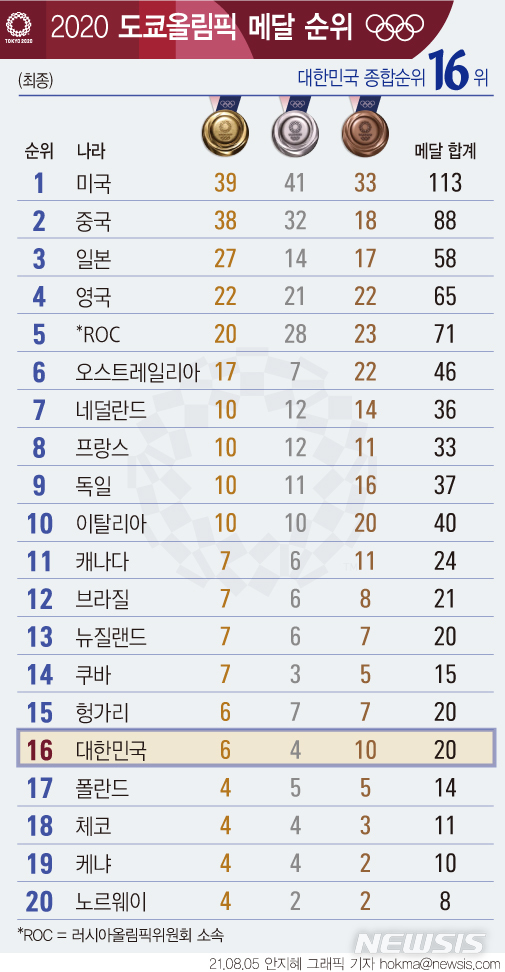 [그래픽] 2020도쿄올림픽 메달 순위…한국, 종합 16위