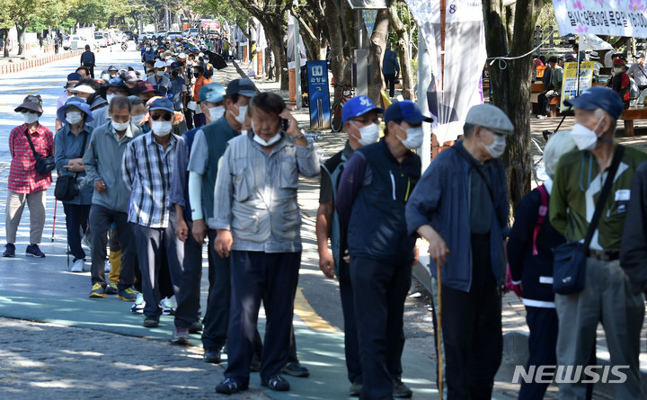배식 차례 기다리는 무료급식소 긴 행렬