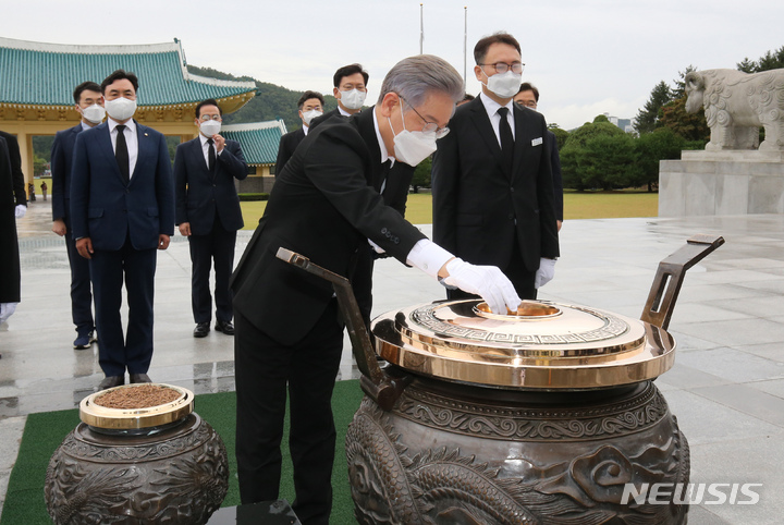 국립대전현충원 참배하는 이재명 민주당 대선후보