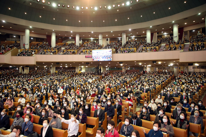 '위드 코로나' 첫 주말, 교회 예배당 가득메운 신도들