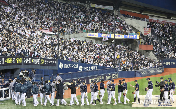 만원관중 아래 '준PO 승리한 두산'