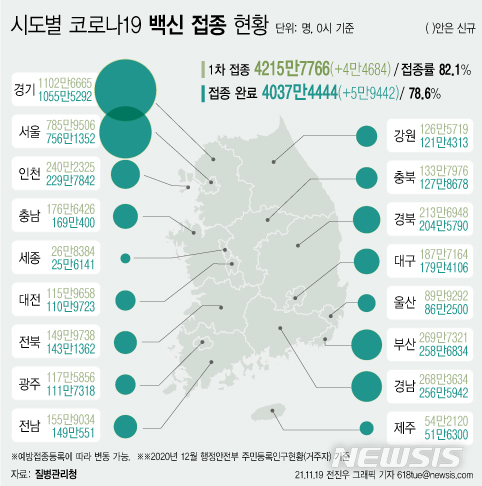 [그래픽] 시도별 코로나19 백신 접종…1차 경기 1102.6만, 서울 785.9만명