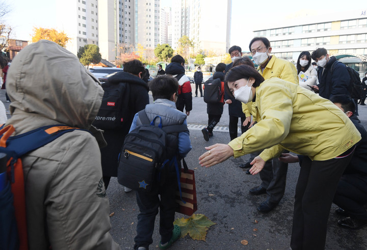 학생들 맞이하는 유은혜 부총리
