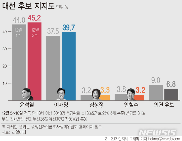 [그래픽] 윤석열 45.2% 이재명 39.7%…격차 5.5%p (리얼미터)
