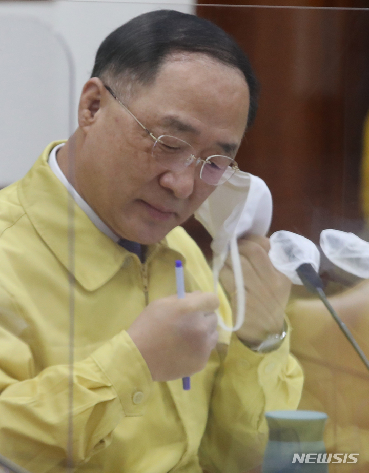 비상경제 중대본 회의, 발언 앞서 마스크 벗는 홍남기 부총리