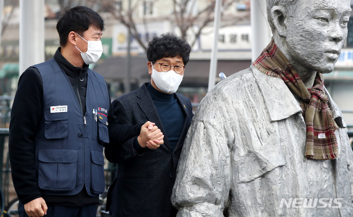 양경수 위원장과 손 맞잡은 한상균 전 위원장