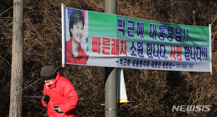 박근혜 전 대통령 현수막 재정비 하는 지지자